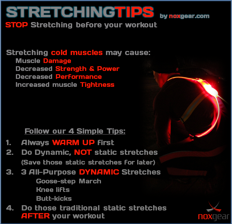 It’s never good when you find out that you were doing something that you thought was helping you, but it was actually hurting you. This certainly seems to be the case when it comes to stretching. All too often I see runners stretching cold muscles without warming up first. Believe it or not this can actually damage your muscles and tendons by causing micro-tears, and not the good kind that you get from loading a muscle during exercise. Also it sends the wrong signal to the neuromuscular system. If you’re about to run, the last thing you want to do is tell the muscles that they need to relax by performing static stretches. Avoid the most common mistakes when it comes to stretching by following our basic Stretching Tips.